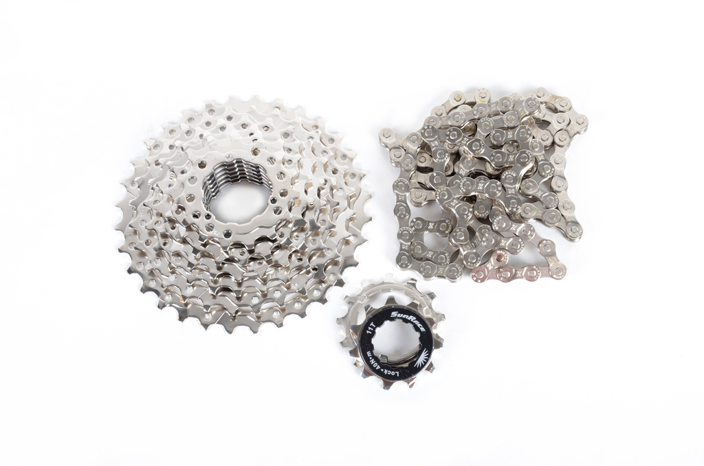 Kjede og kassett. Sett som inneholder et 8-delt KMC-kjede og en 8-delt Sunrace-kassett med 11-32T utveksling.