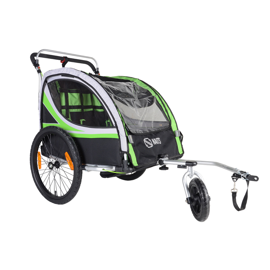 Meget praktisk sykkelvogn med flere bruksområder. Vognen er lett og stabil og passer både til sykkel og som trille-/joggevogn. Det snurrbare fronthjulet kan låses for en bedre joggeopplevelse. Vognen kan enkelt legges sammen for oppbevaring. Barnet sitter trygt med en 5 punkts sikkerhetssele. Vognen har en kraftig brems på håndtaket, som også kan benyttes som parkeringsbrems. Romslig oppbevaringsrom bak som kan lukkes med glidelås. Maksvekt 45 kg inkludert vognen. | Pakkeantall: 1