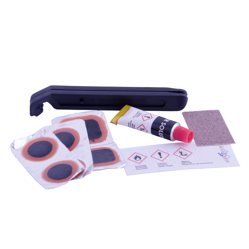 Lappesaker som inneholder det man trenger for fikse en punktering. Esken inneholder lim, lapper og skrubb Det er ingen informasjon om sammensetning for denne varen