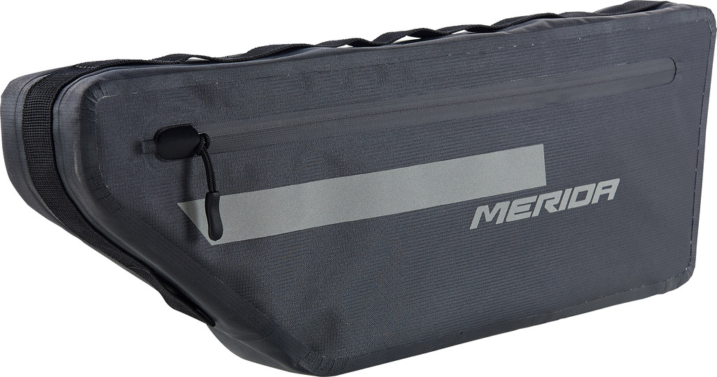 Merida Travel rammeveske er perfekt for overnattingsturer eller enhver sykkeltur der du bare trenger litt ekstra utstyr. Ved å plassere vesken under overrøret kan du fylle den ubrukte plassen inne i rammen og holde utstyret innen rekkevidde, slik at du ikke trenger å stige av sykkelen for å få tak i det du trenger. Den monteres raskt og enkelt på nesten hvilken som helst ramme ved hjelp av flere justerbare borrelåsremmer og vil ikke rasle rundt under sykkelturen. Det sterke, ripstop-materialet er vanntett for å holde utstyret ditt trygt og tåler selv de tøffeste forholdene. Det indre rommet er allsidig, og en intern skillevegg hjelper deg med å holde utstyret organisert. Skilleveggen kan enkelt fjernes. Vesken har også nettinglomme for verdigjenstander som kontanter og nøkler. Reflekterende detaljer bidrar til å holde deg trygg på veiene.